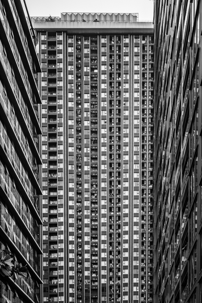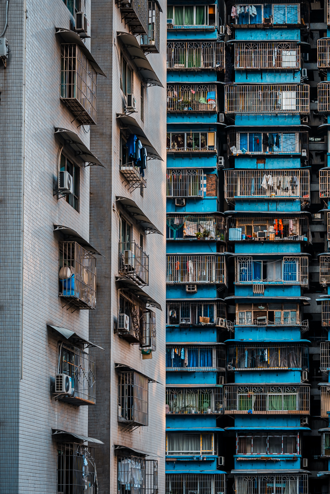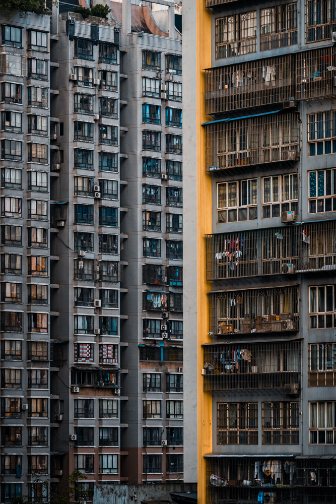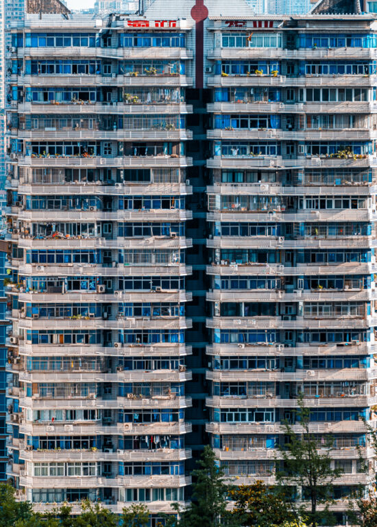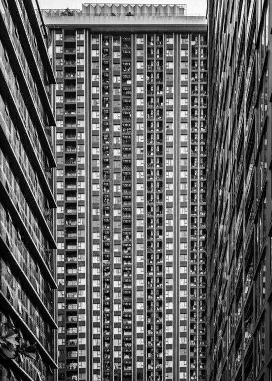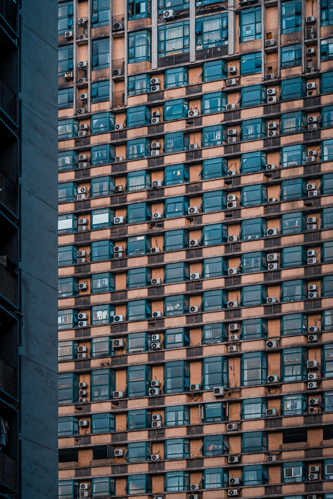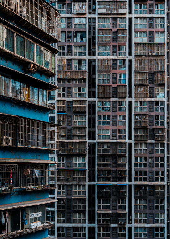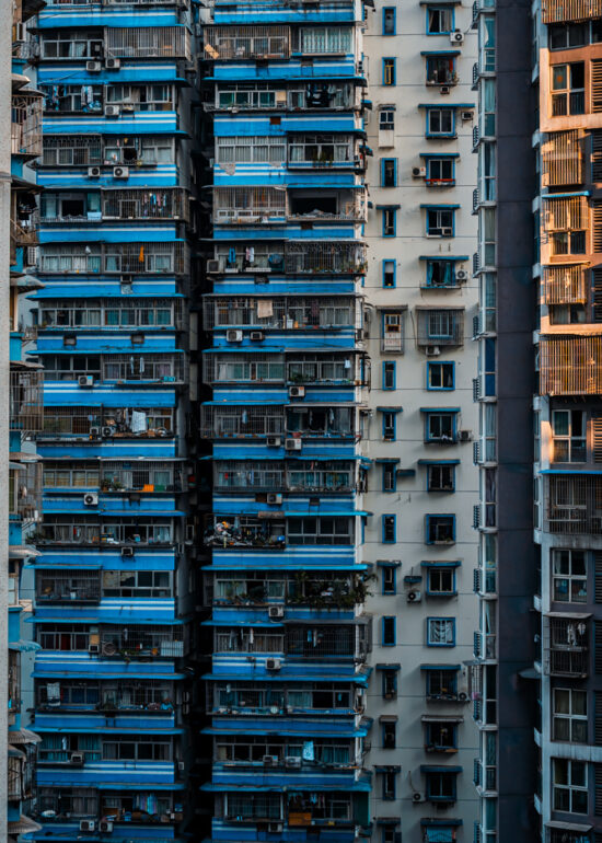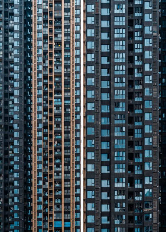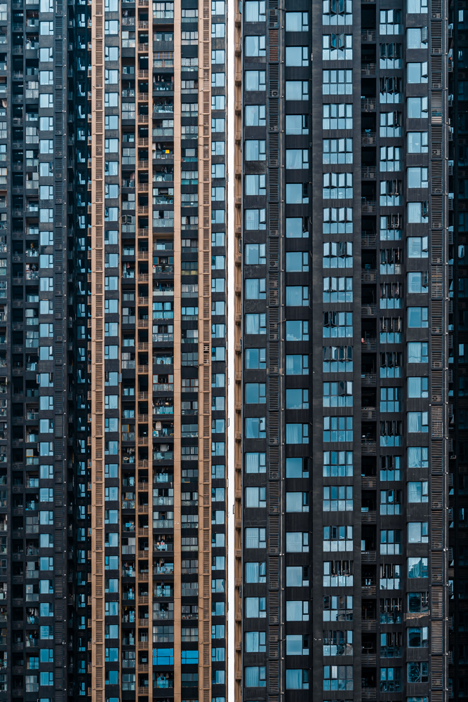 By focusing on repetition and scale, it highlights the intensity of vertical living environments.