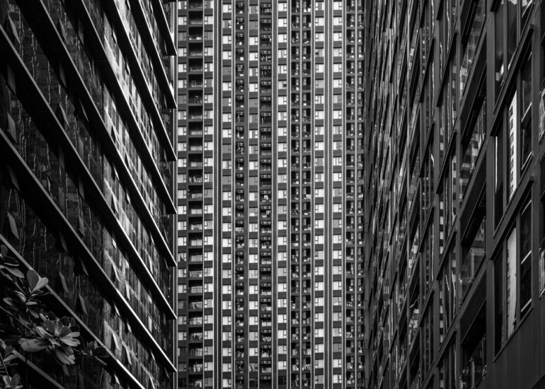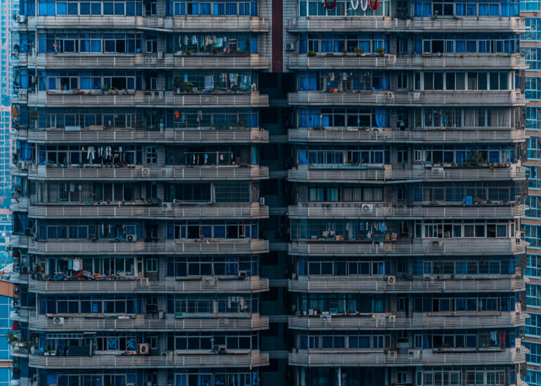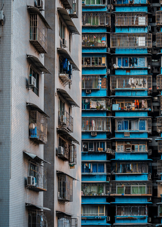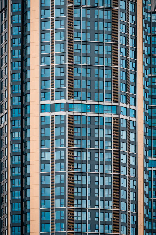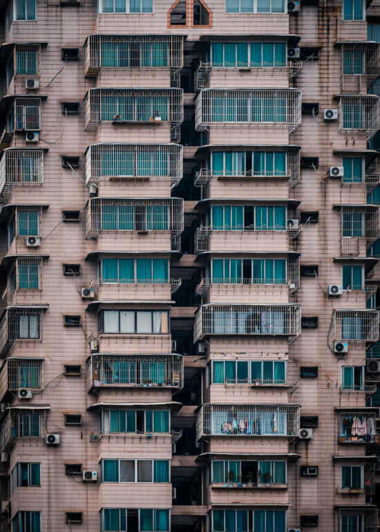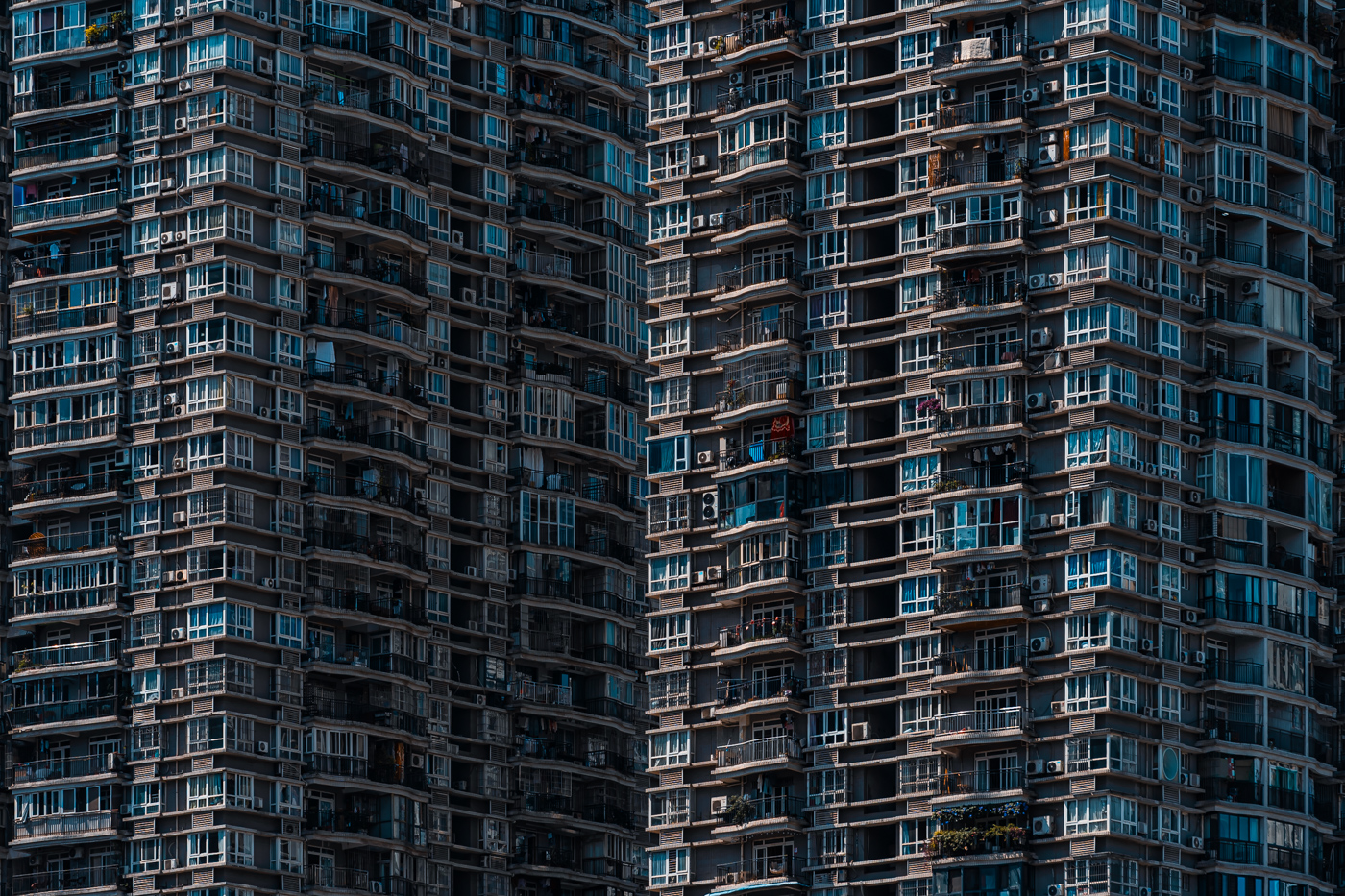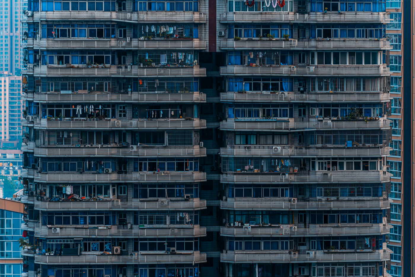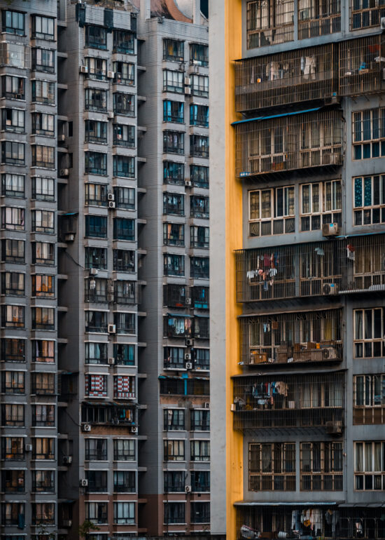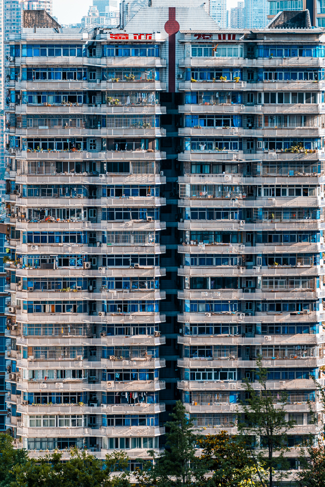 By focusing on repetition and scale, it highlights the intensity of vertical living environments.