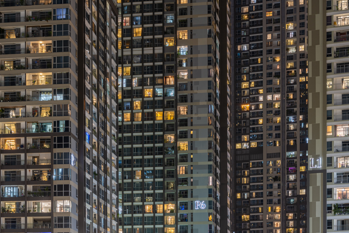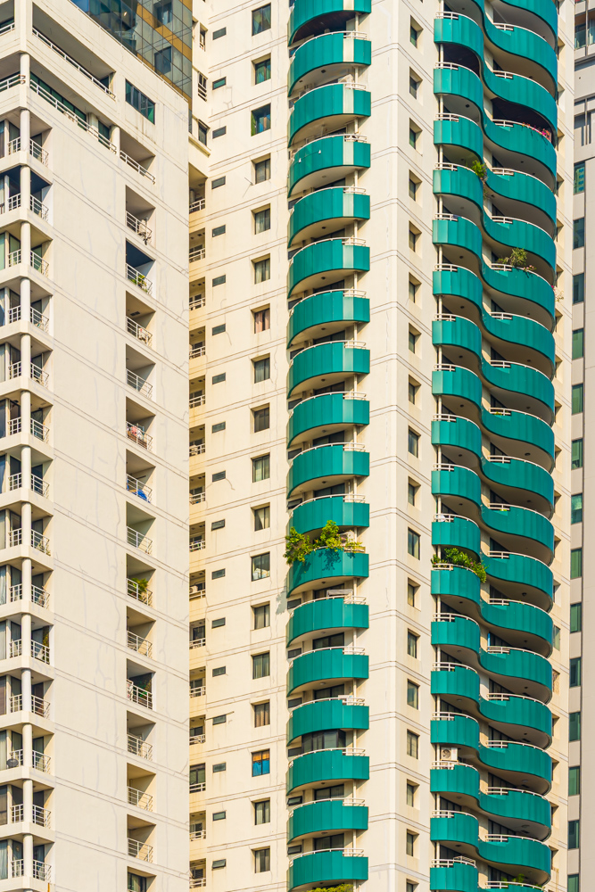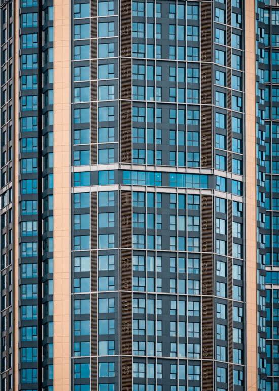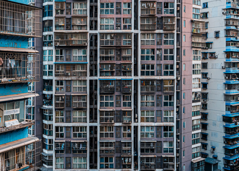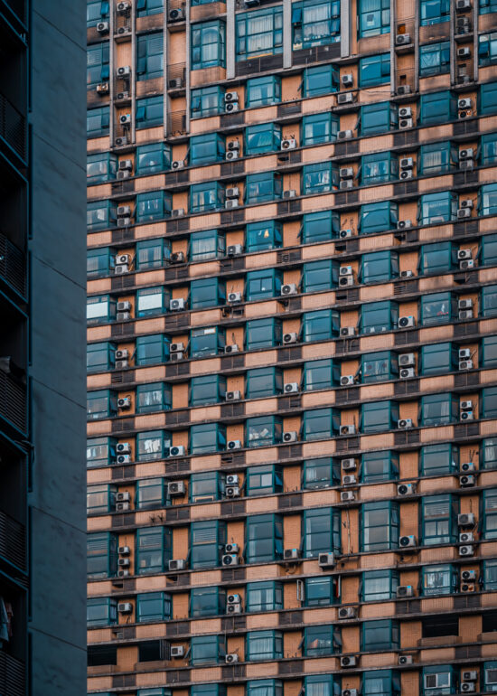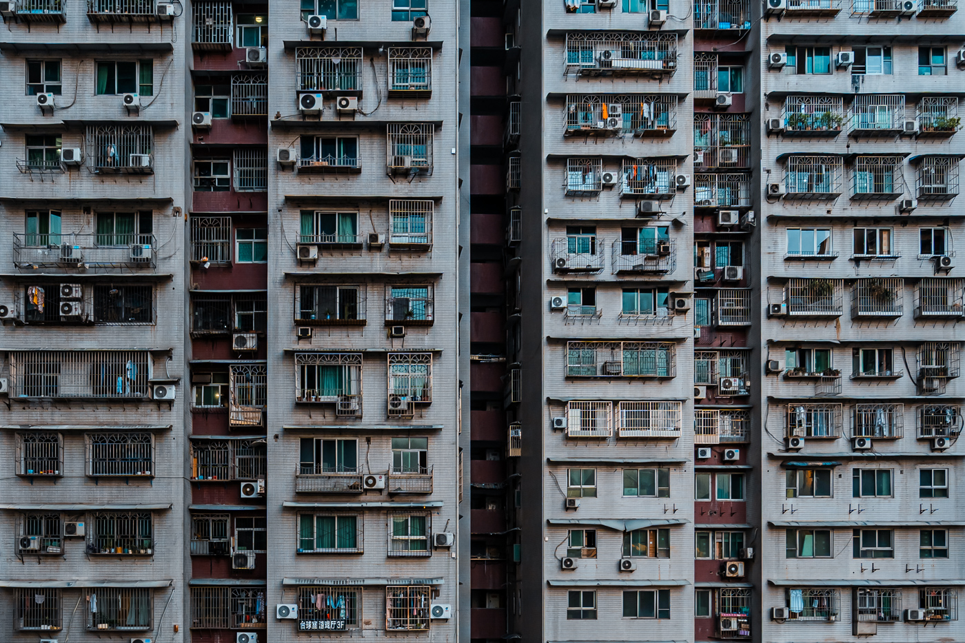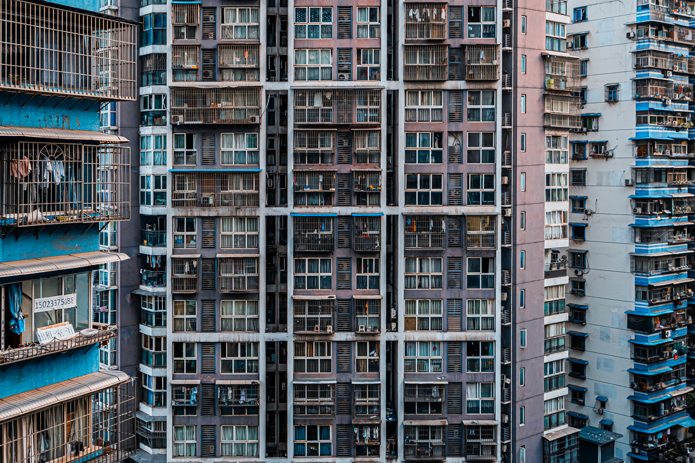 By focusing on repetition and scale, it highlights the intensity of vertical living environments.