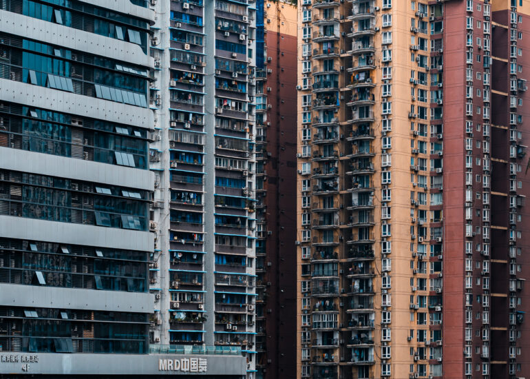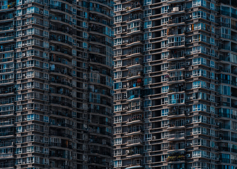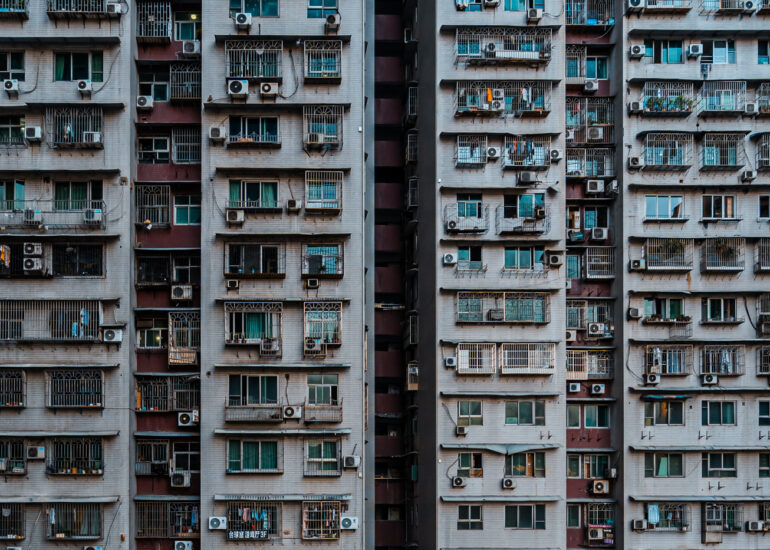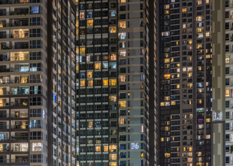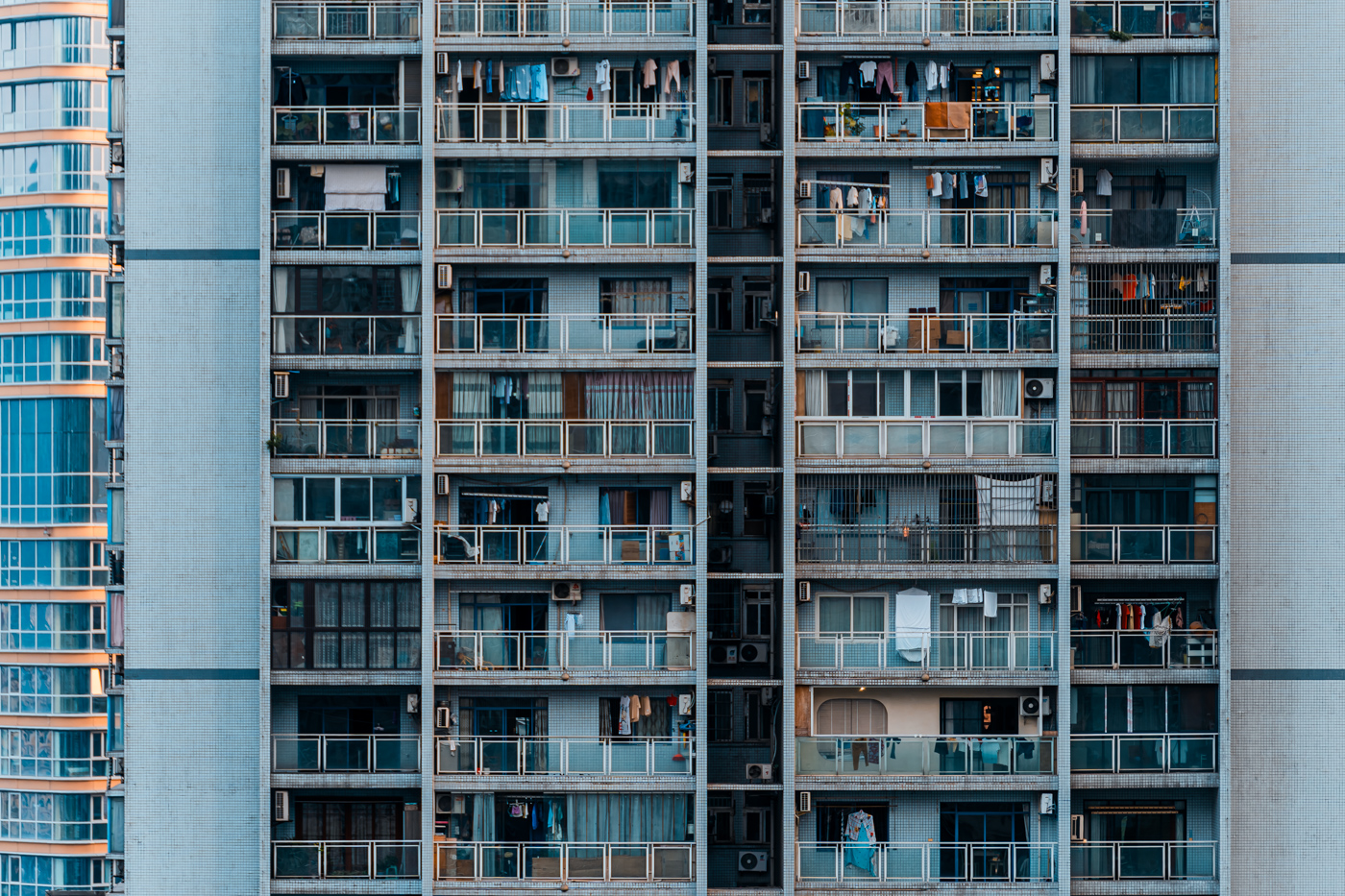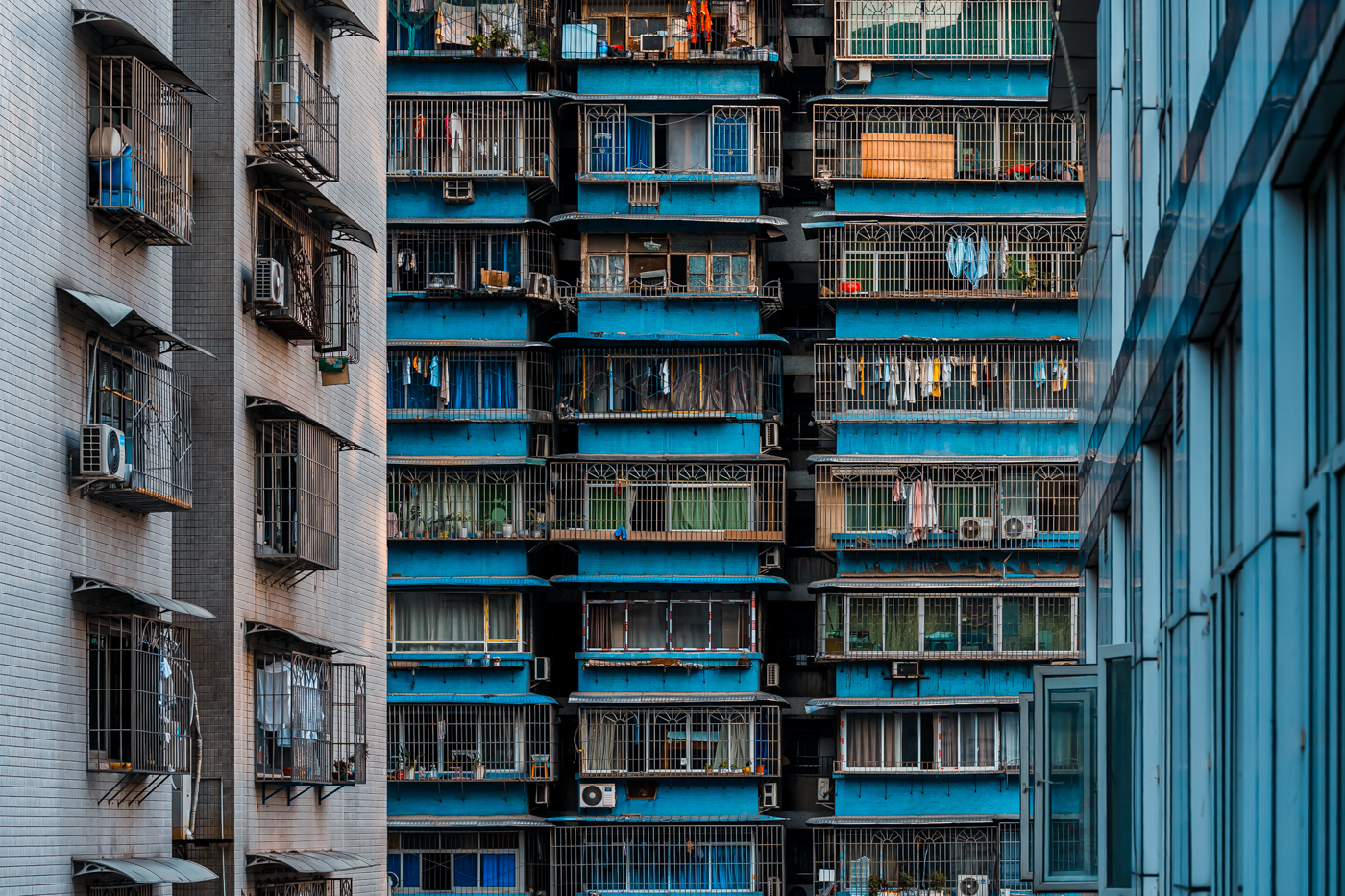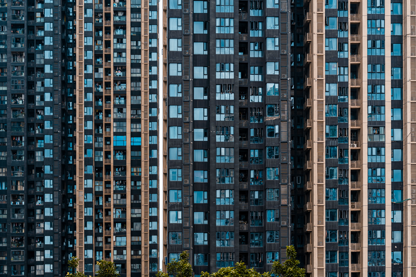 By focusing on repetition and scale, it highlights the intensity of vertical living environments.