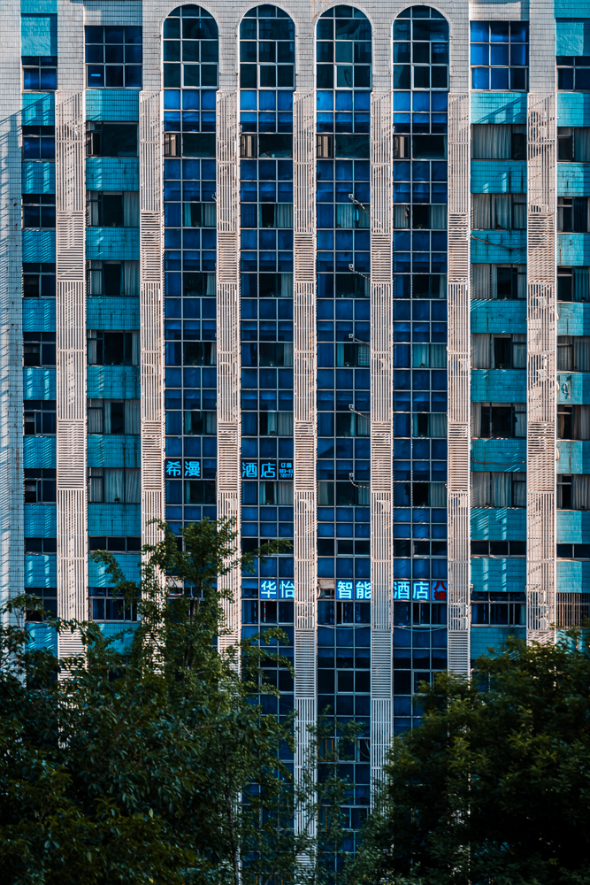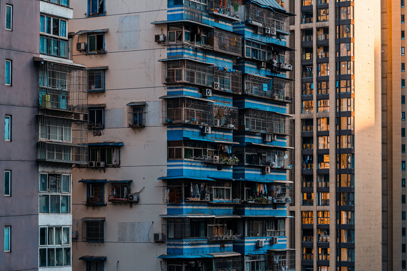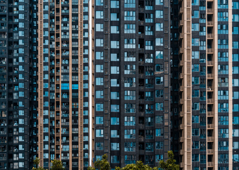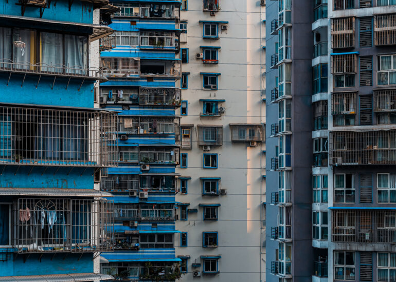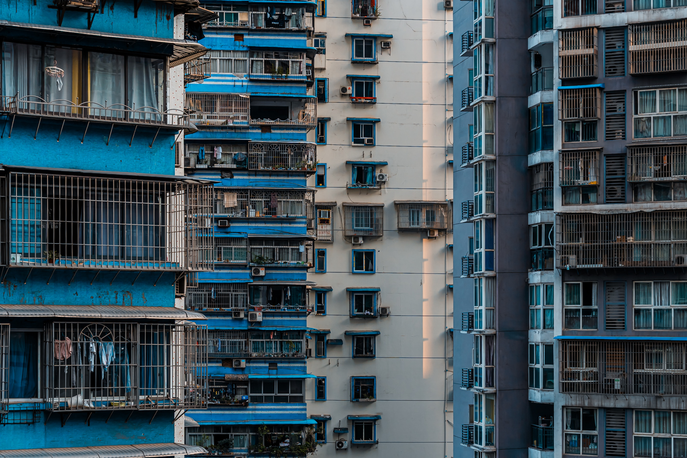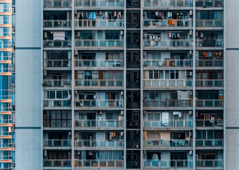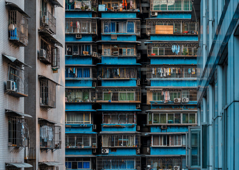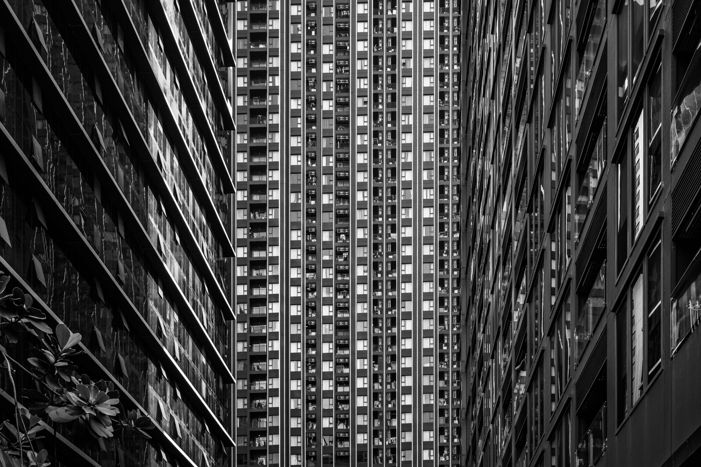 By focusing on repetition and scale, it highlights the intensity of vertical living environments.
